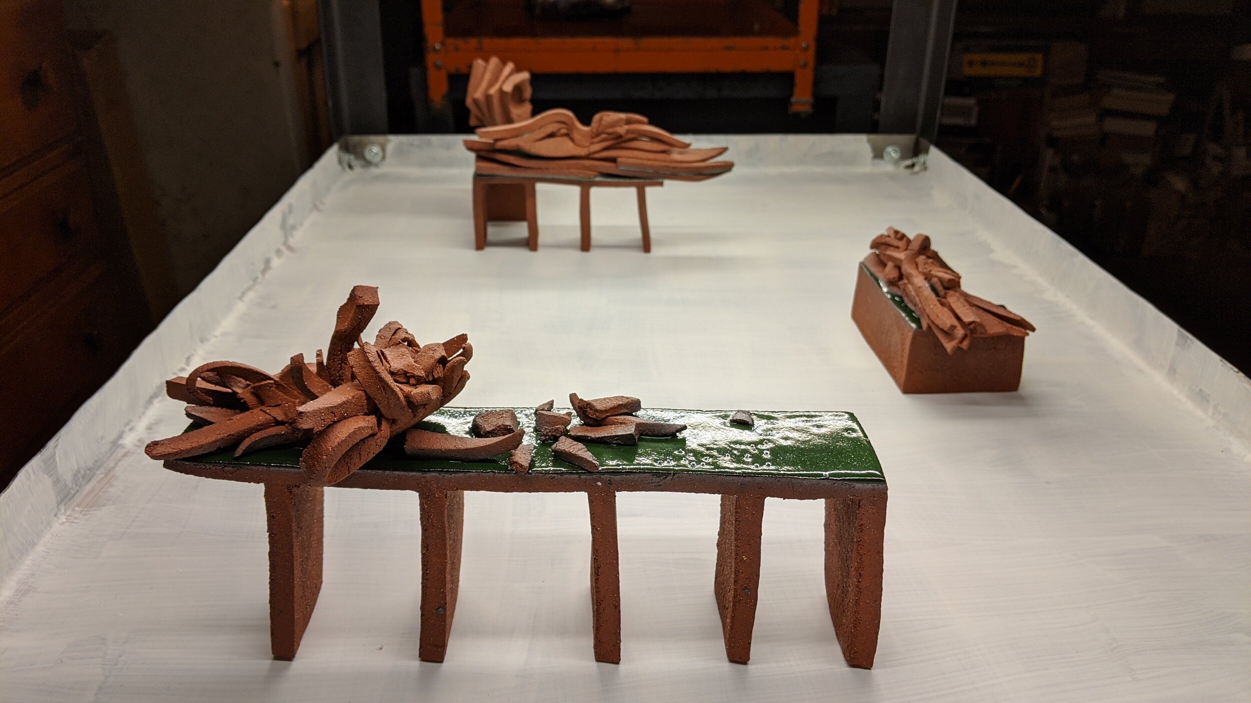 installation of Self Portrait, Self Portrait (salt & pepper), and Imagine a metal duck at Barely Fair at Julius Caesar